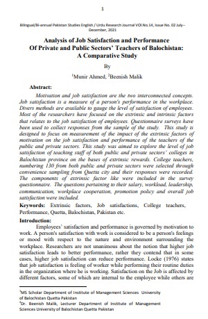 Analysis of Job Satisfaction and Performance of Private and Public Sectors’ Teachers of Balochistan: A Comparative Study