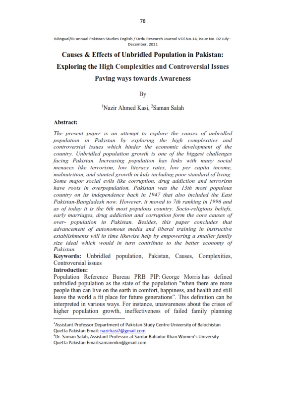 Causes & Effects of Unbridled Population in Pakistan Exploring the High Complexities and Controversial Issues Paving ways towards Awareness