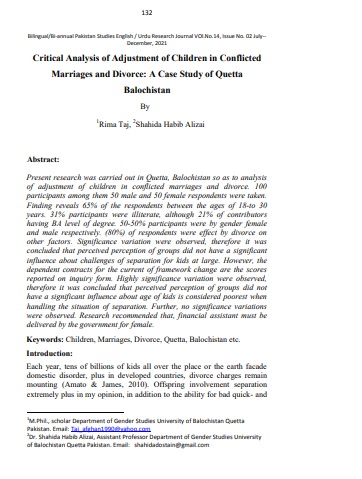 Critical Analysis of Adjustment of Children in Conflicted Marriages and Divorce: A Case Study of Quetta Balochistan