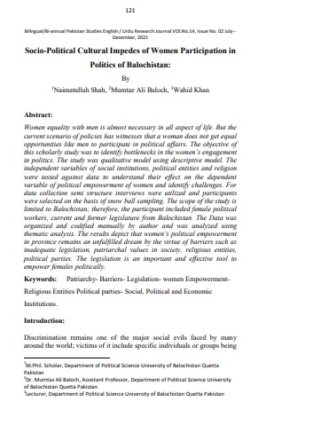 Socio-Political Cultural Impedes of Women Participation in Politics of Balochistan