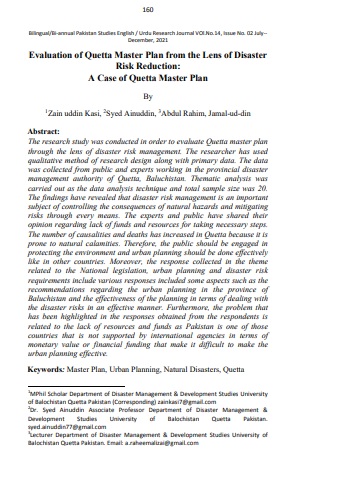 Evaluation of Quetta Master Plan from the Lens of Disaster Risk Reduction: A Case of Quetta Master Plan