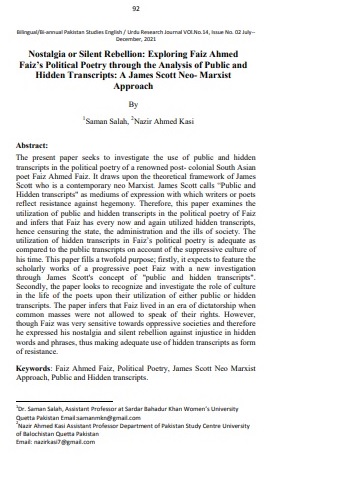 Nostalgia or Silent Rebellion: Exploring Faiz Ahmed Faiz’s Political Poetry through the Analysis of Public and Hidden Transcripts: A James Scott Neo- Marxist Approach