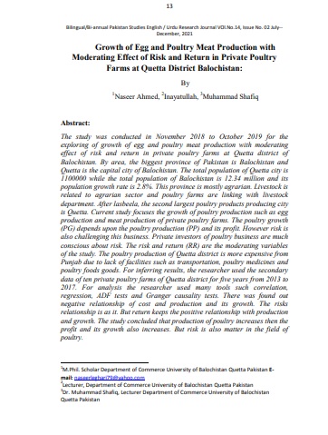 Growth of Egg and Poultry Meat Production with Moderating Effect of Risk and Return in Private Poultry Farms at Quetta District Balochistan
