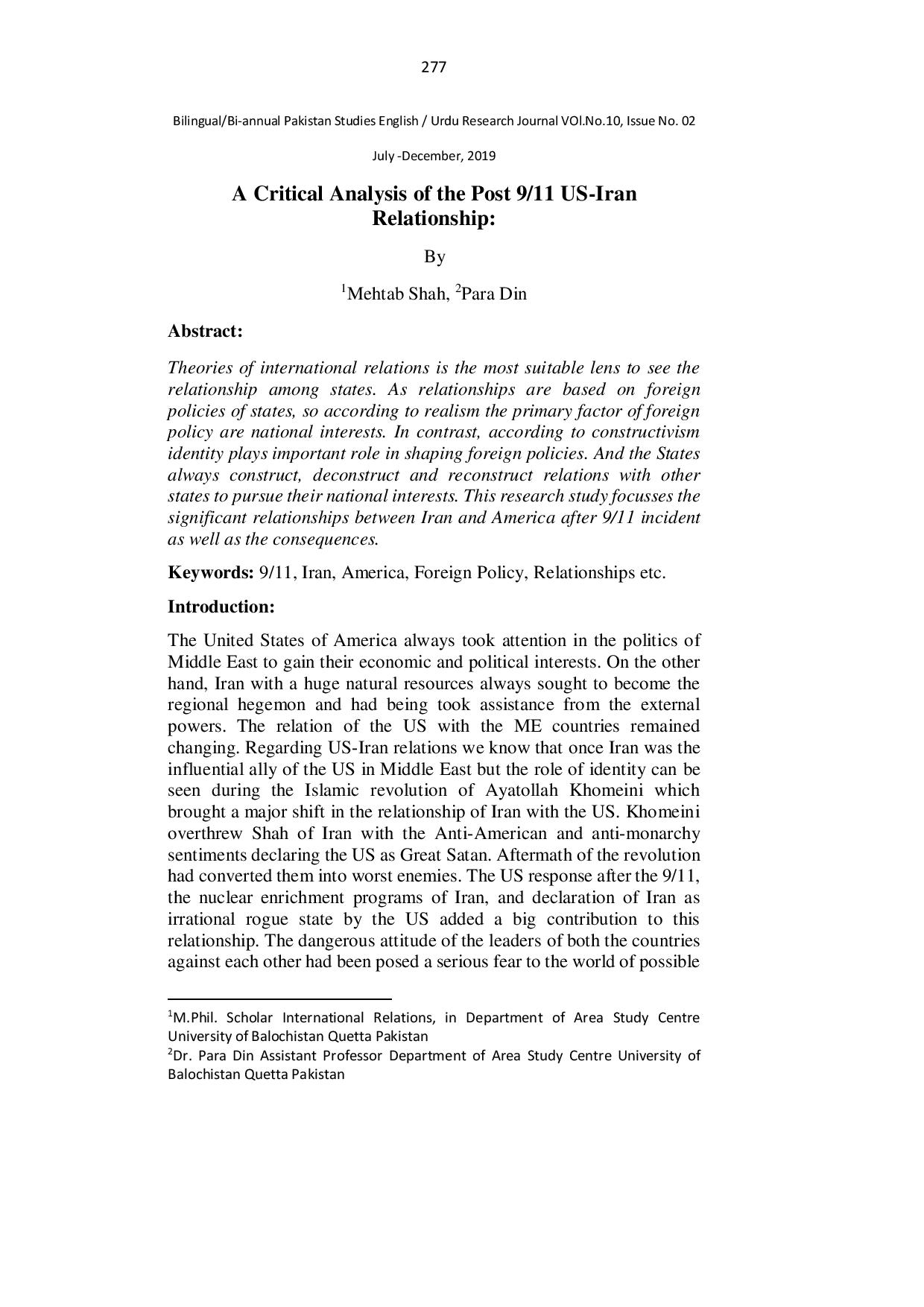A Critical Analysis of the Post 9.11 US-Iran Relationship