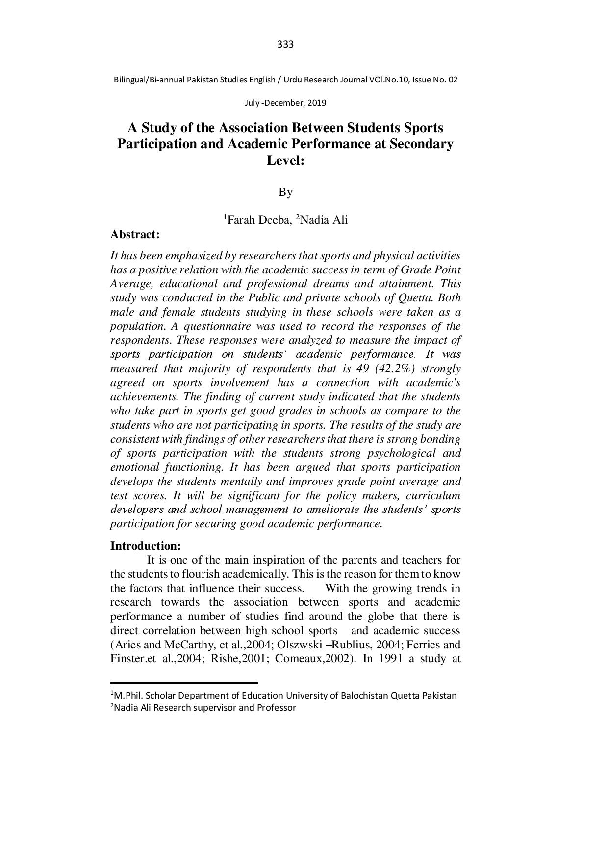A Study of the Association Between Students Sports Participation and Academic Performance at Secondary Level
