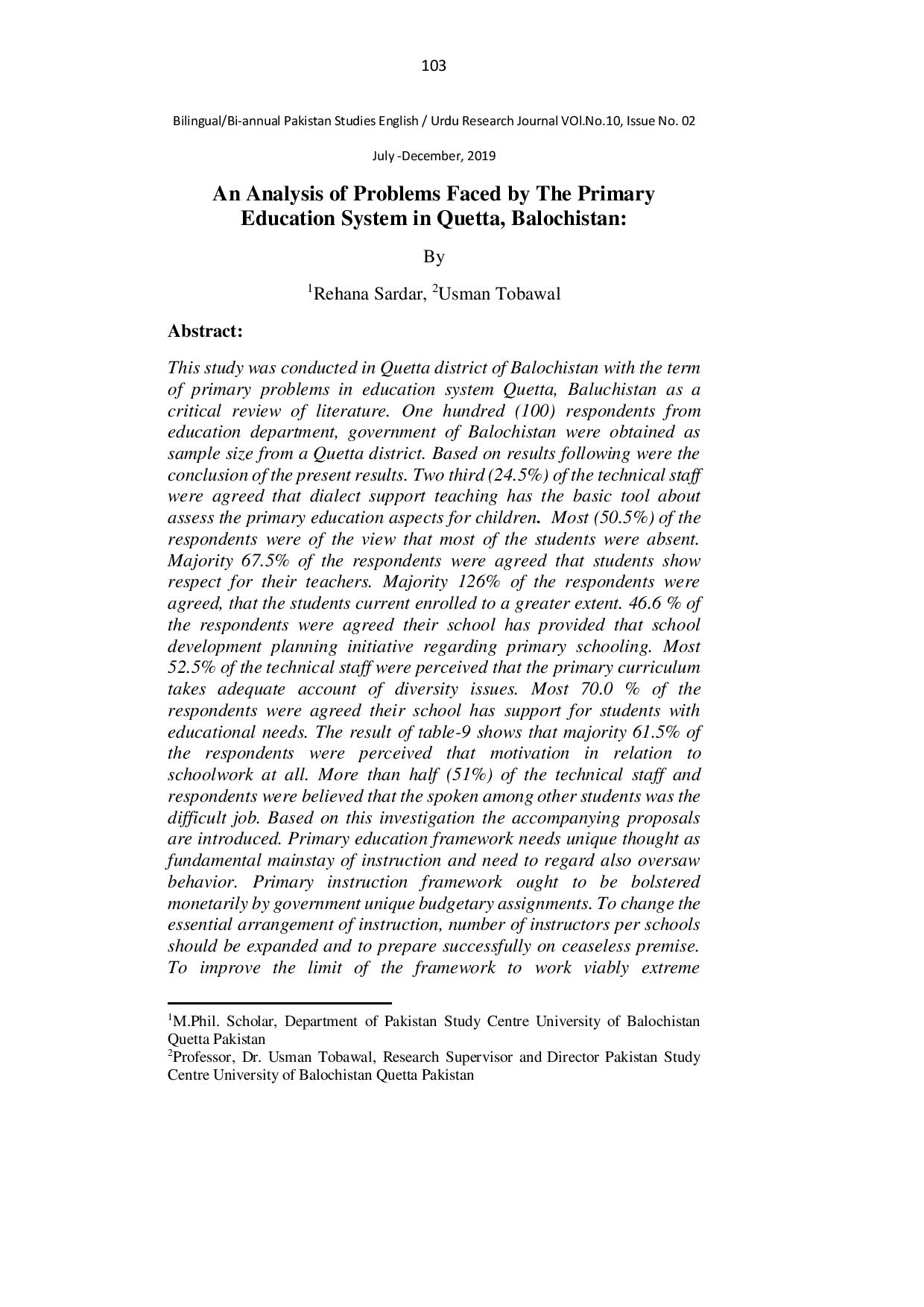 An Analysis of Problems Faced by The Primary Education System in Quetta, Balochistan