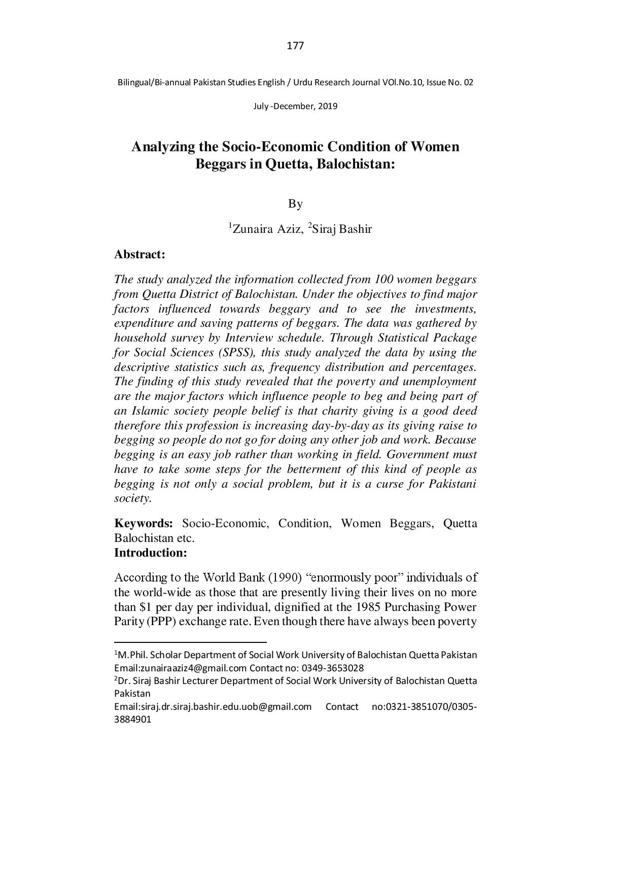 Analysing the Socio-Economic Condition of Women Beggars in Quetta, Baluchistan
