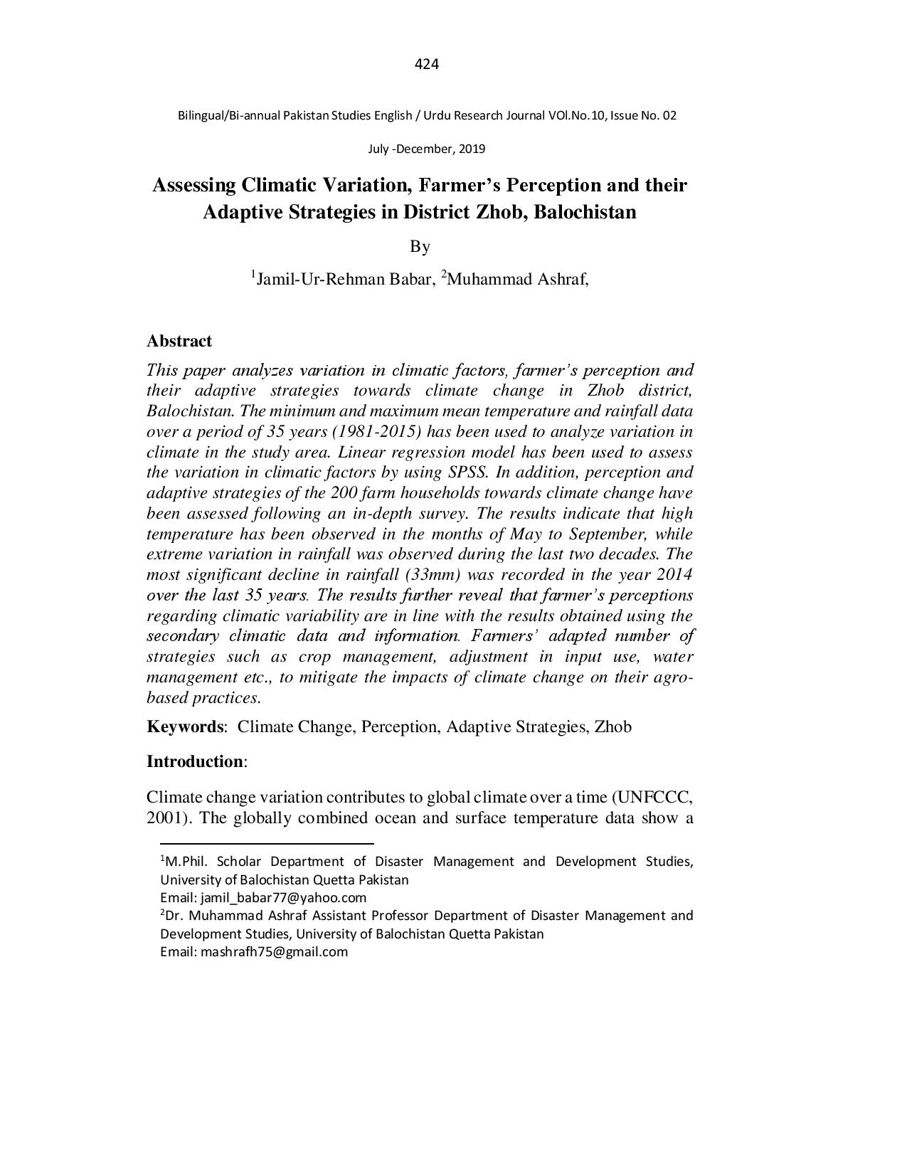 Assessing Climatic Variation, Farmer’s Perception and their Adaptive Strategies in District Zhob, Balochistan