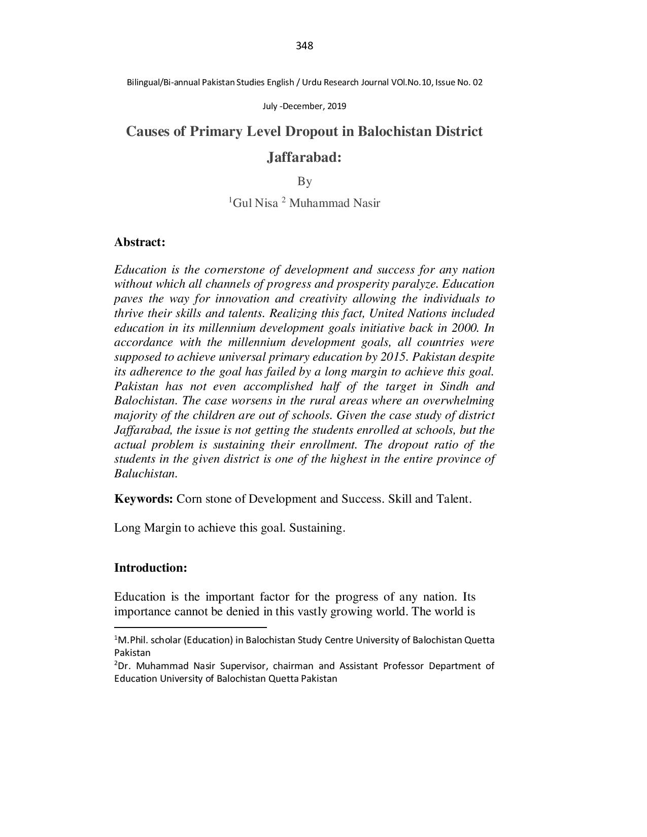 Causes of Primary Level Dropout in Balochistan District Jaffarabad