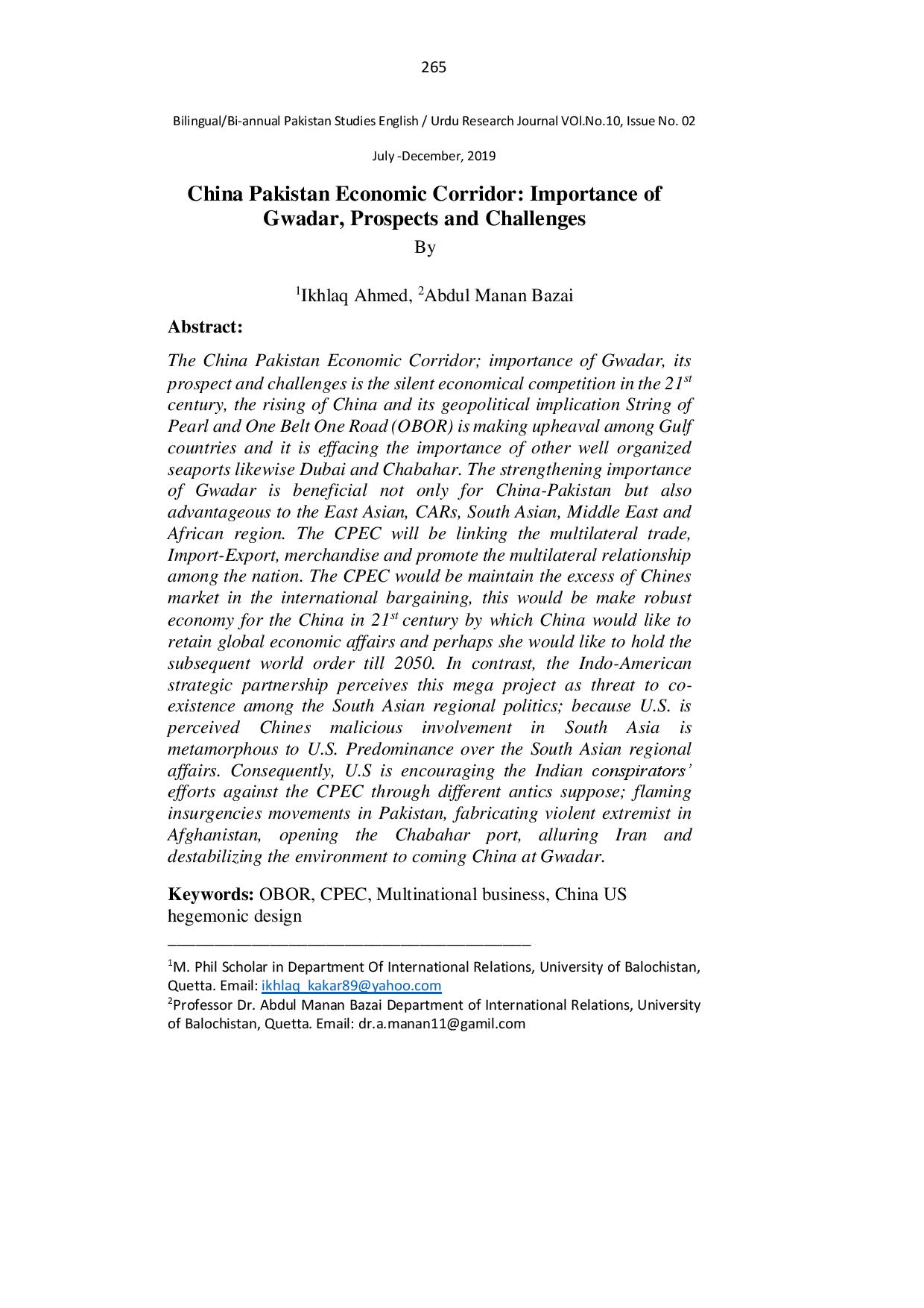 China Pakistan Economic Corridor Importance of Gwadar, Prospects and Challenges