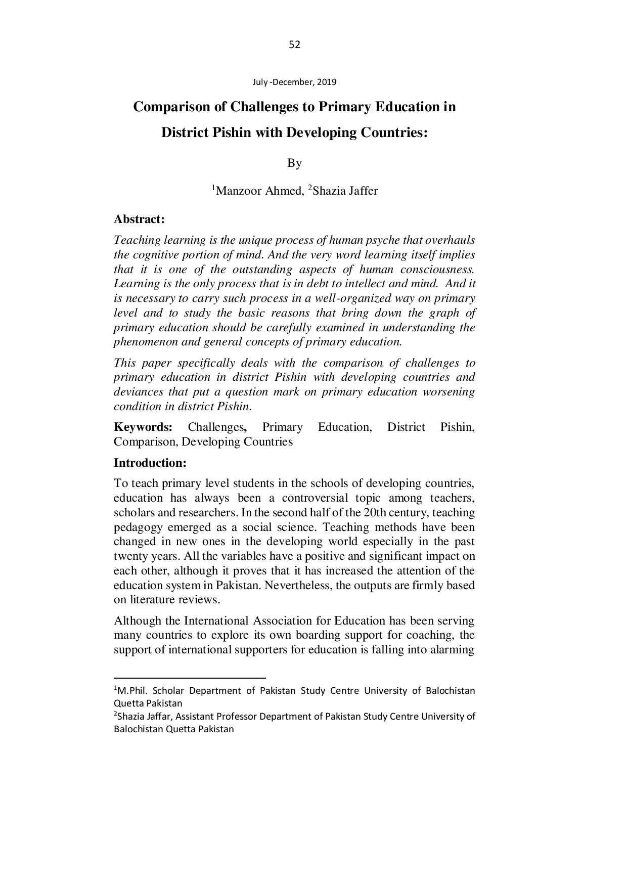 Comparison of Challenges to Primary Education in District Pishin with Developing Countries