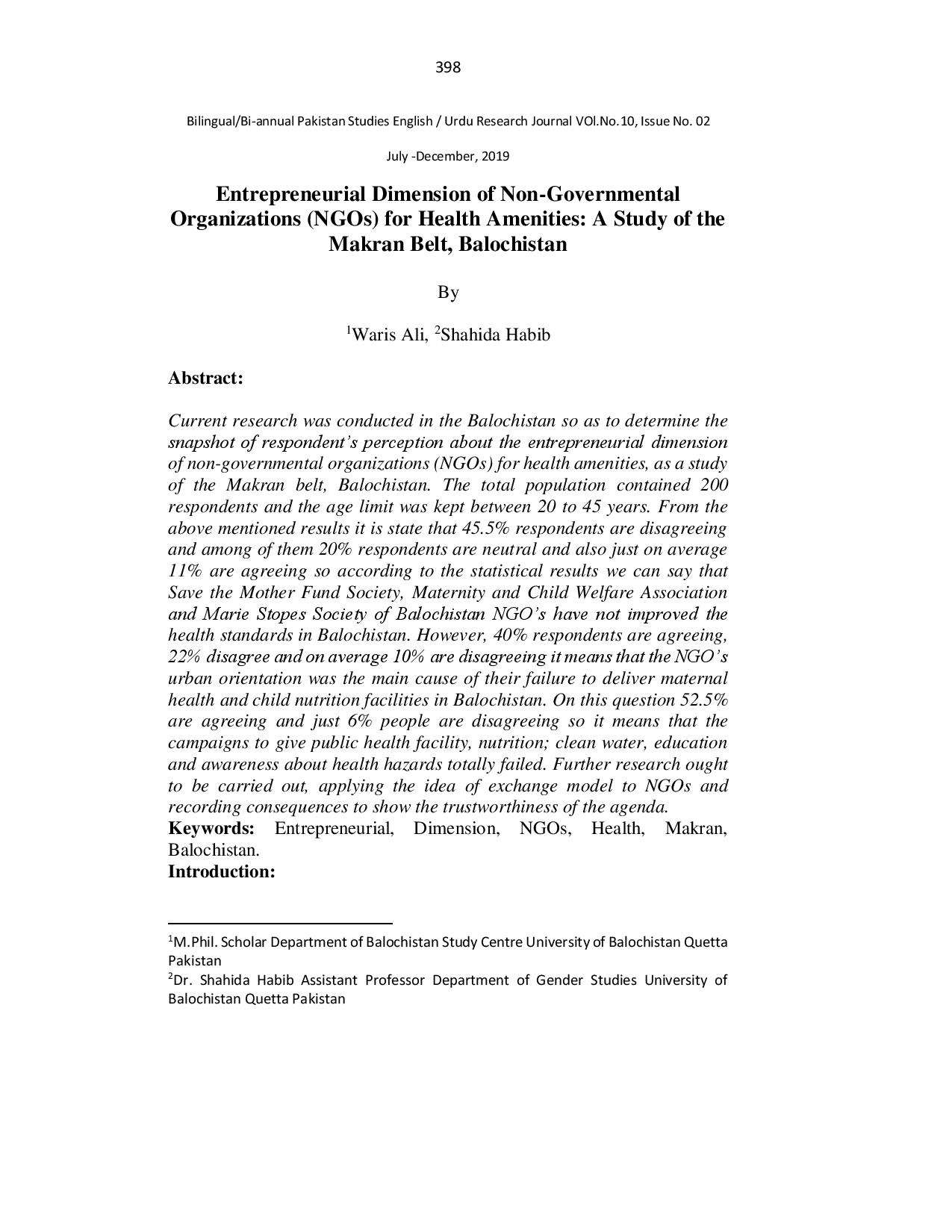 Entrepreneurial Dimension of Non-Governmental Organizations (NGOs) for Health Amenities A Study of the Makran Belt, Balochistan