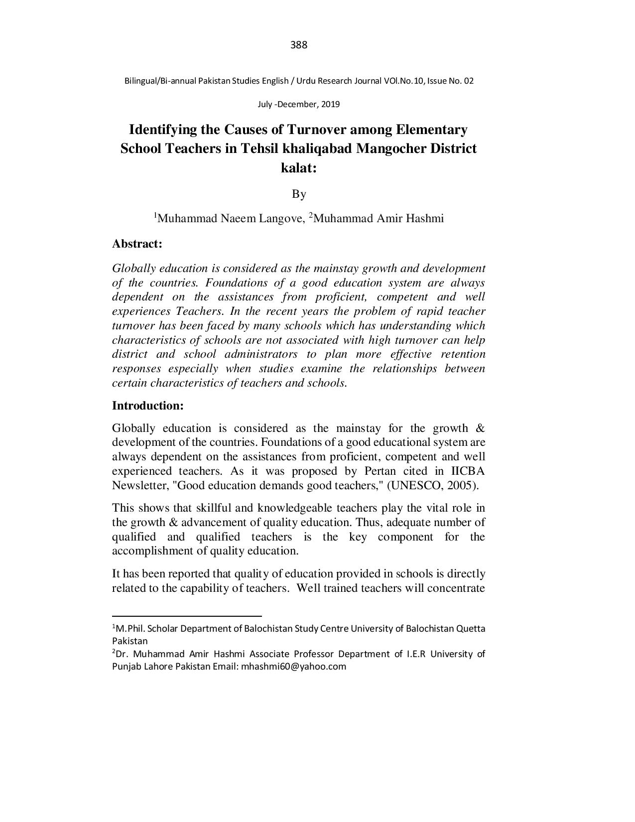 Identifying the Causes of Turnover among Elementary School Teachers in Tehsil Khalilabad Mangocher District kalat