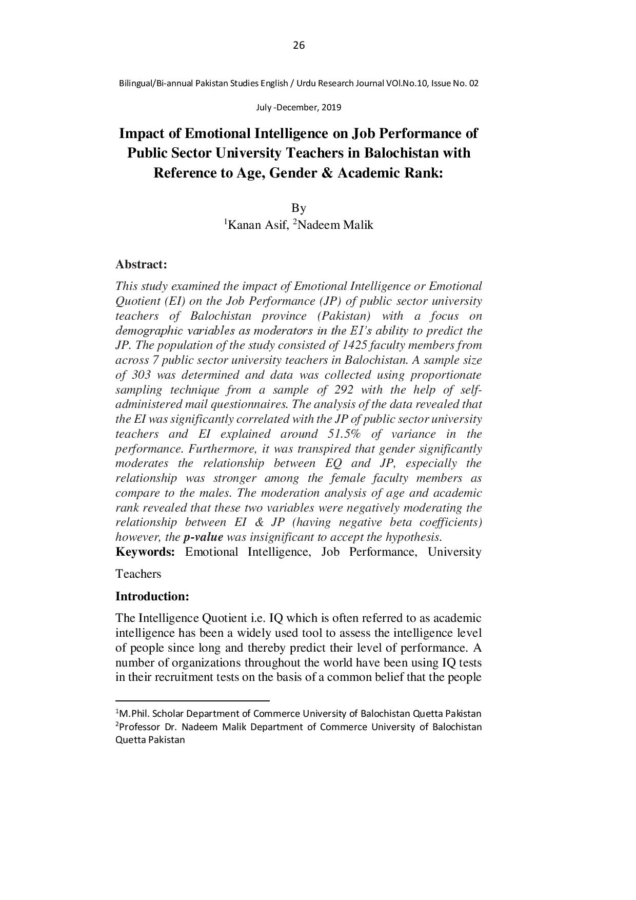 Impact of Emotional Intelligence on Job Performance of Public Sector University Teachers in Balochistan with Reference to Age, Gender & Academic Rank