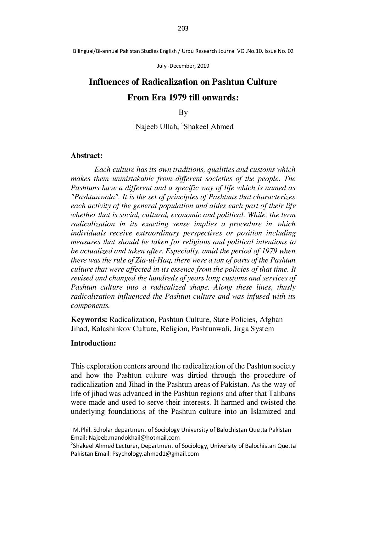 Influences of Radicalization on Pashtun Culture From Era 1979 till onwards