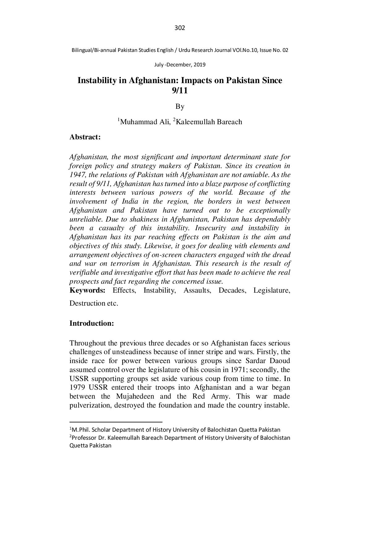 Instability in Afghanistan: Impacts on Pakistan Since 9/11