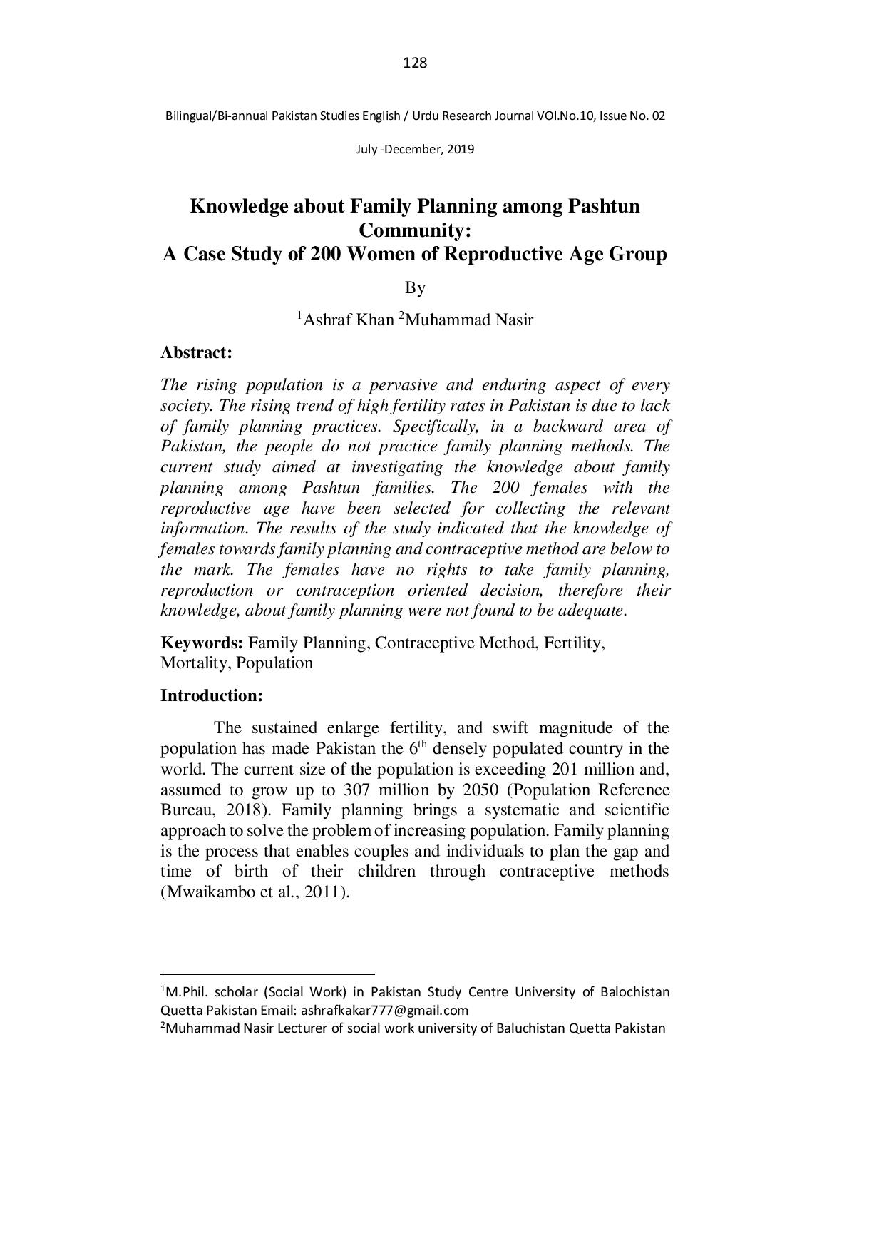 Knowledge about Family Planning among Pashtun Community A Case Study of 200 Women of Reproductive Age Group