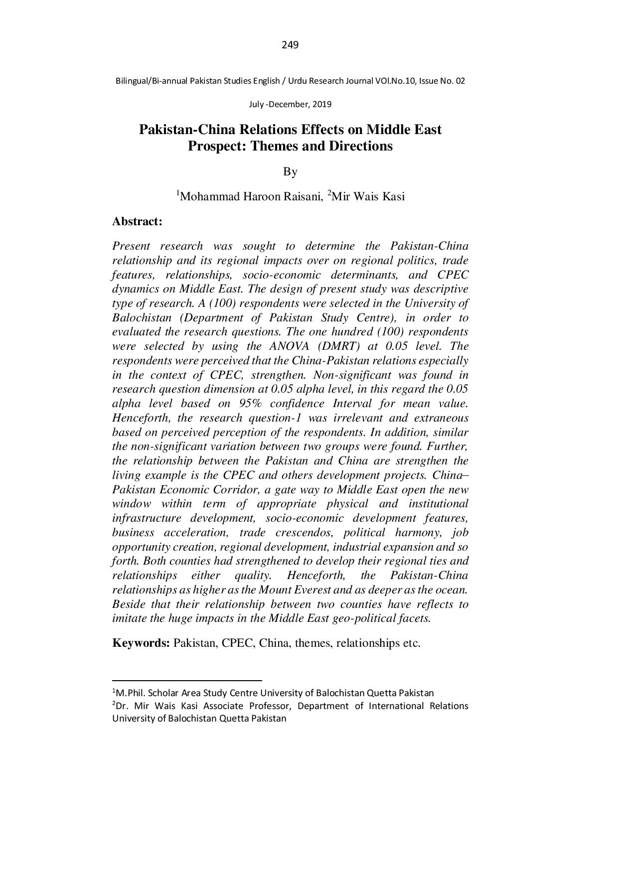 Pakistan-China Relations Effects on Middle East Prospect Themes and Directions