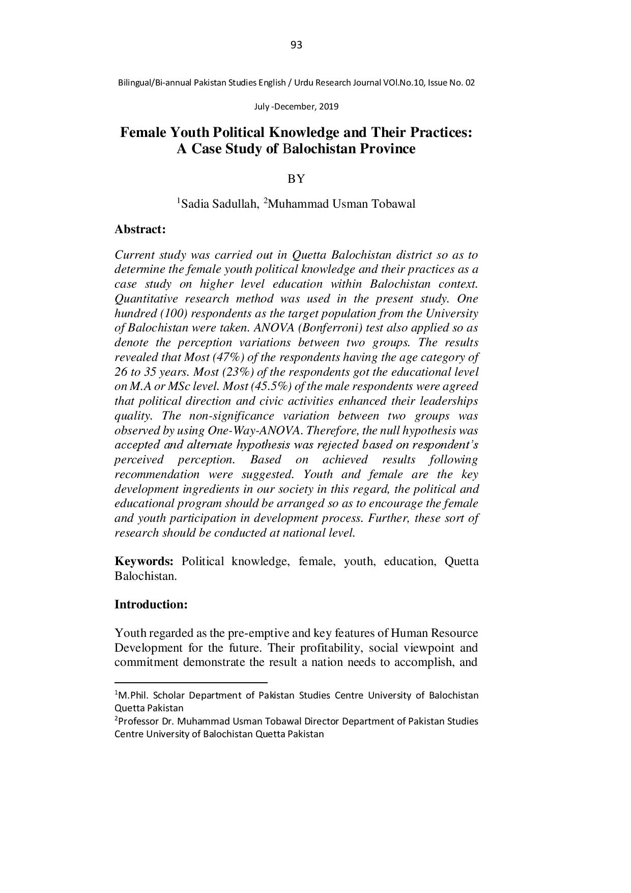 Female Youth Political Knowledge and Their Practices: A Case Study of Balochistan Province