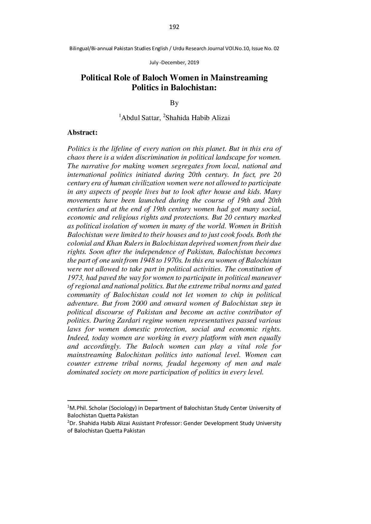 Political Role of Baloch Women in Mainstreaming Politics in Balochistan