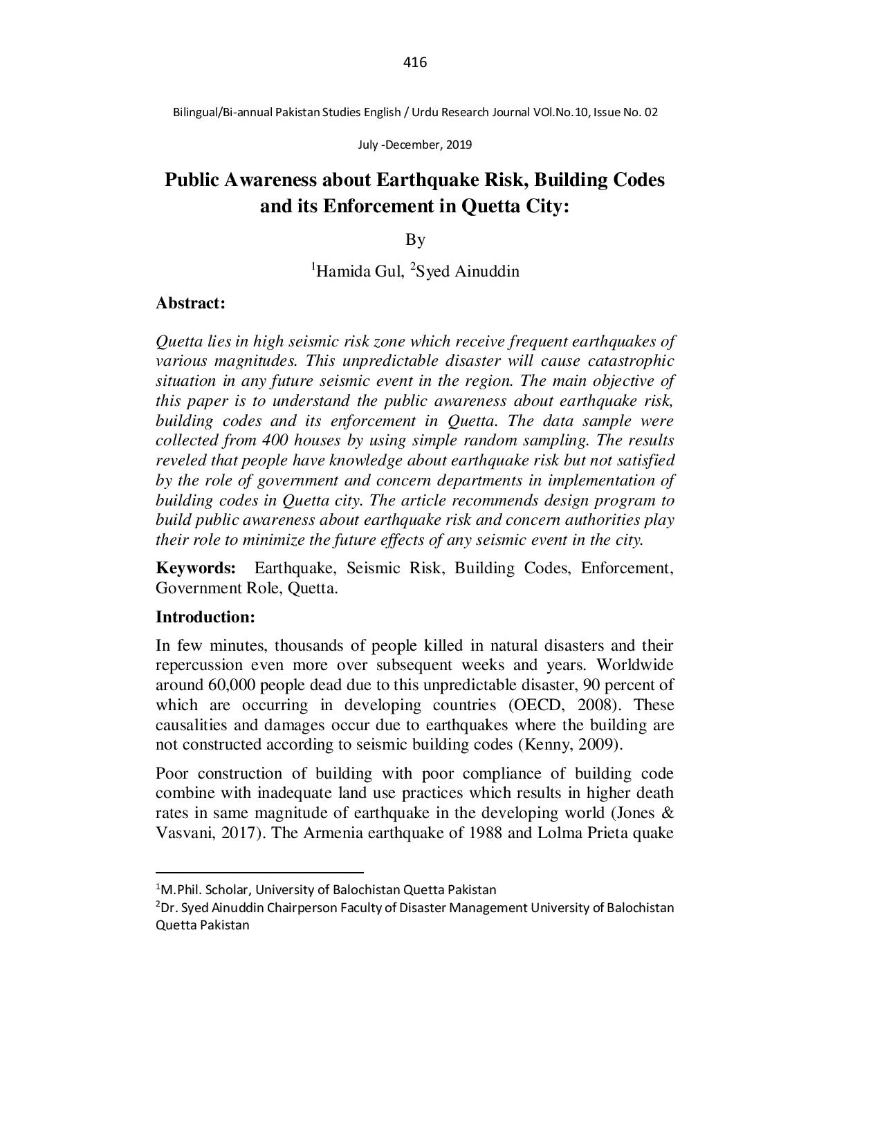 Public Awareness about Earthquake Risk, Building Codes and its Enforcement in Quetta City