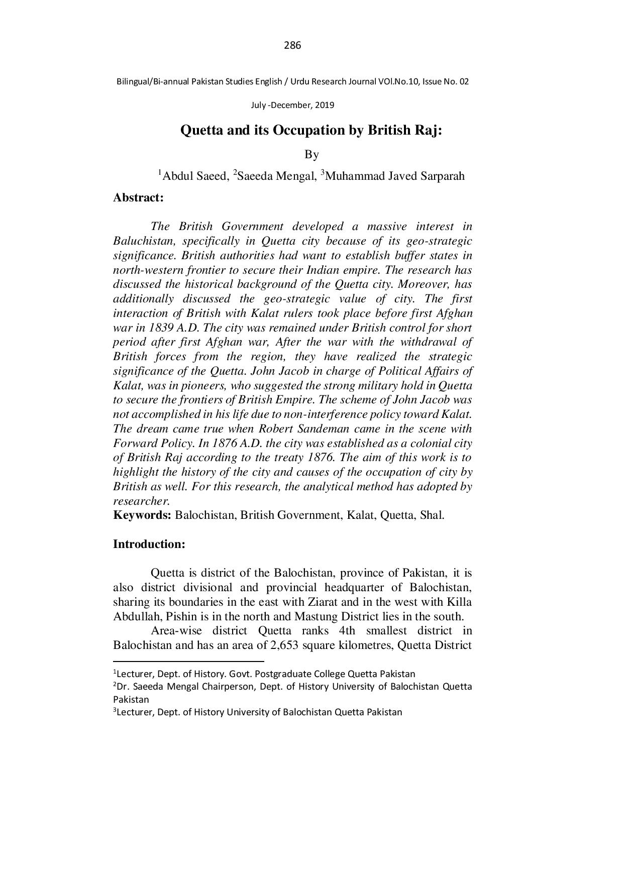 Quetta and its Occupation by British Raj
