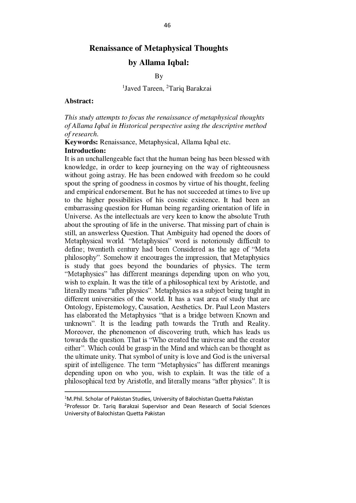 Renaissance of Metaphysical Thoughts by Allama Iqbal