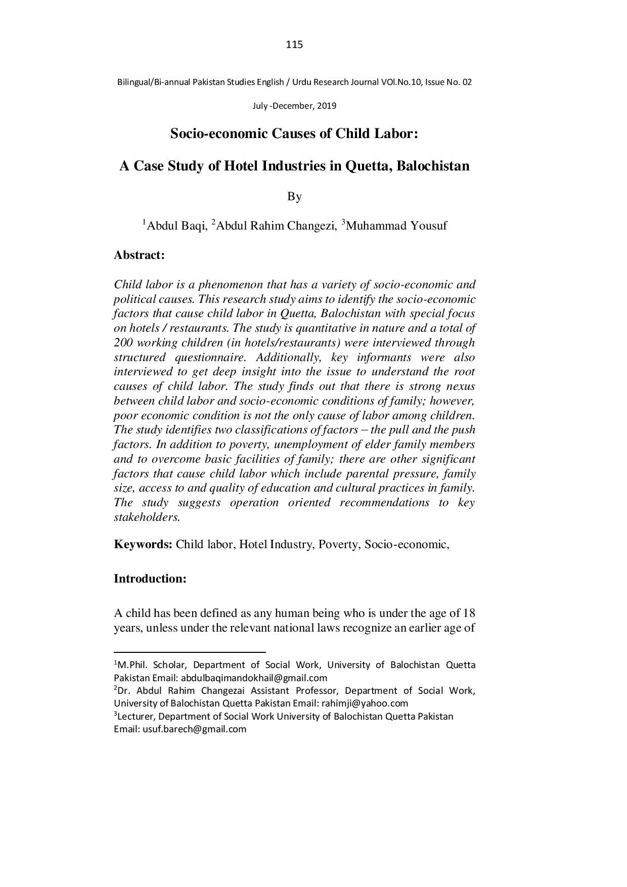 Socio-economic Causes of Child Labor: A Case Study of Hotel Industries in Quetta, Balochistan