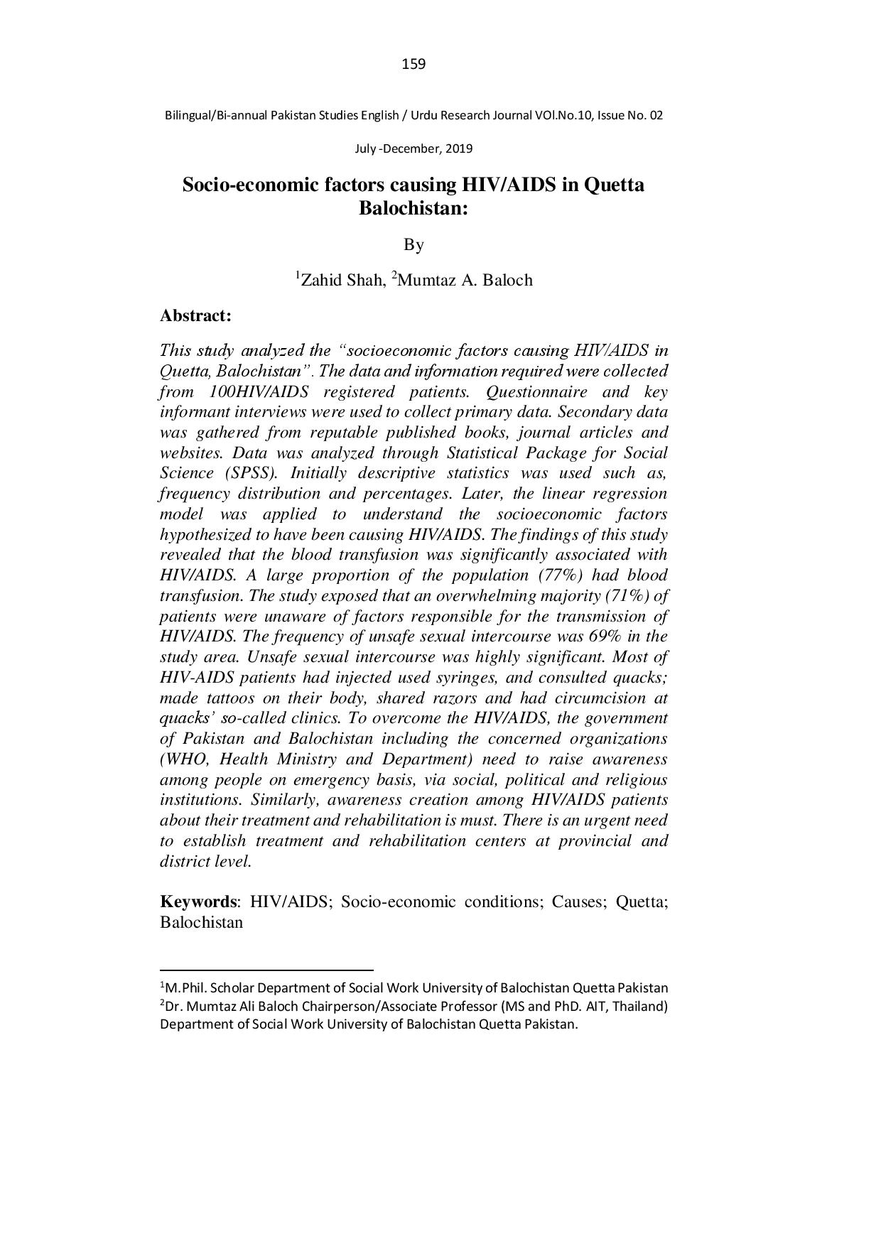 Socio-economic factors causing HIV AIDS in Quetta Balochistan