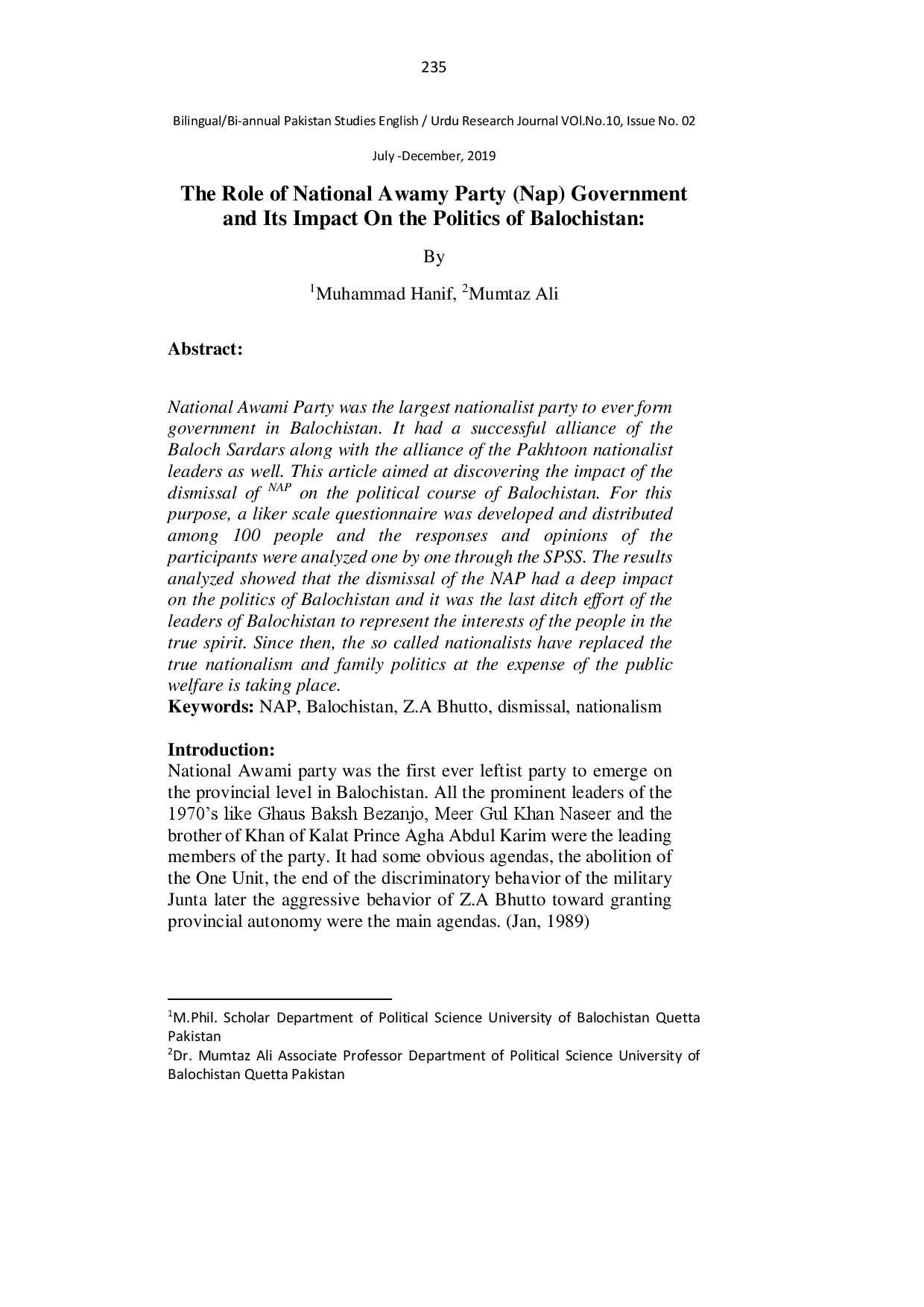 The Role of National Awamy Party (Nap) Government and Its Impact On the Politics of Balochistan