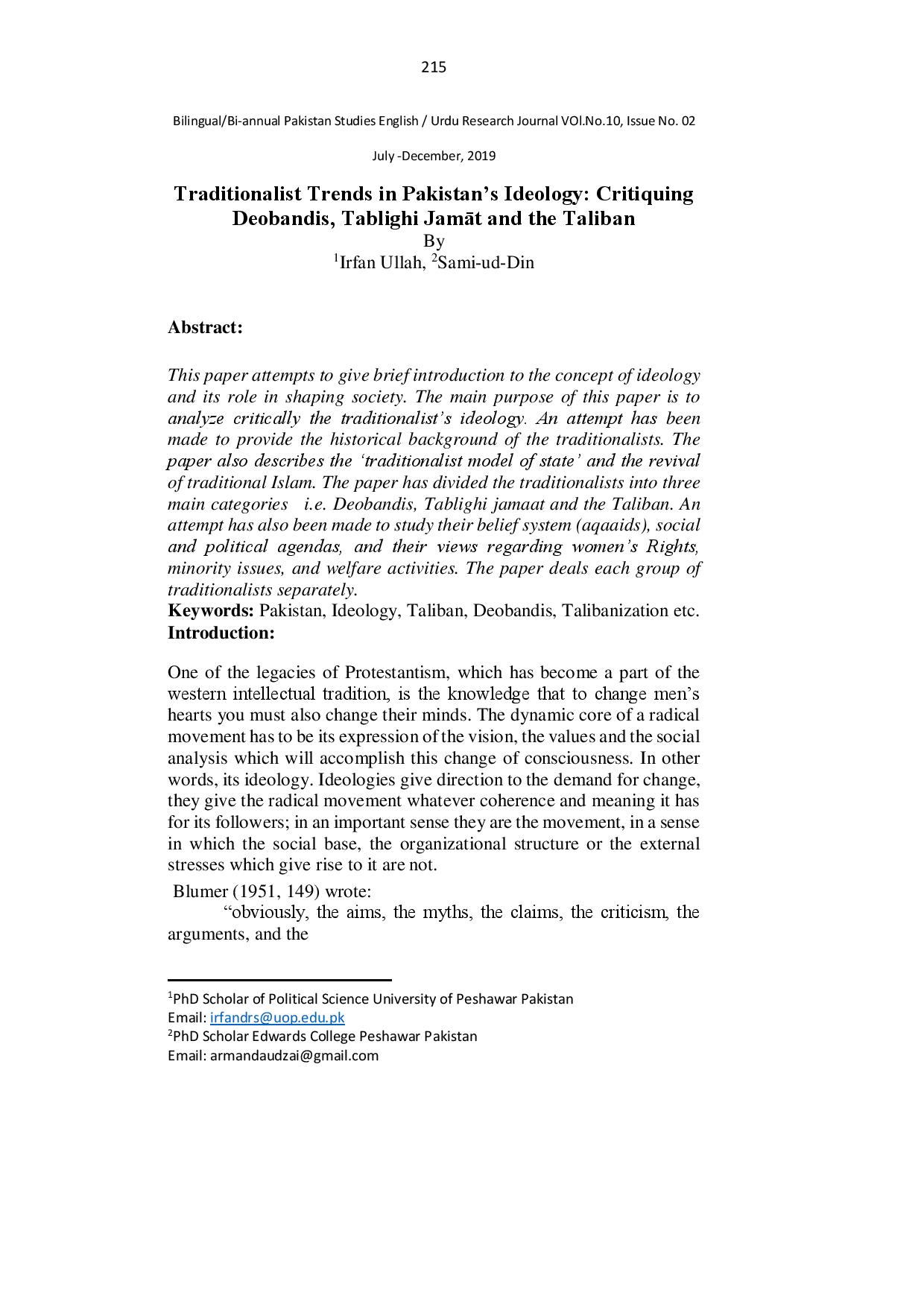 Traditionalist Trends in Pakistan’s Ideology Critiquing Deobandis, Tablighi Jamāt and the Taliban
