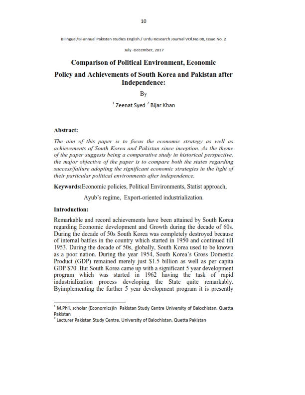 Comparison of Political Environment, Economic Policy and Achievements of South Korea and Pakistan after Independence