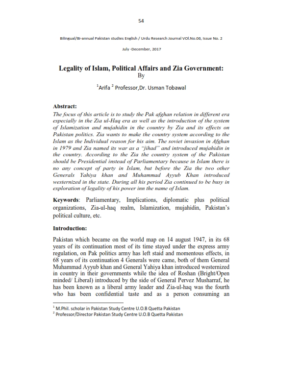 Legality of Islam, Political Affairs and Zia Government