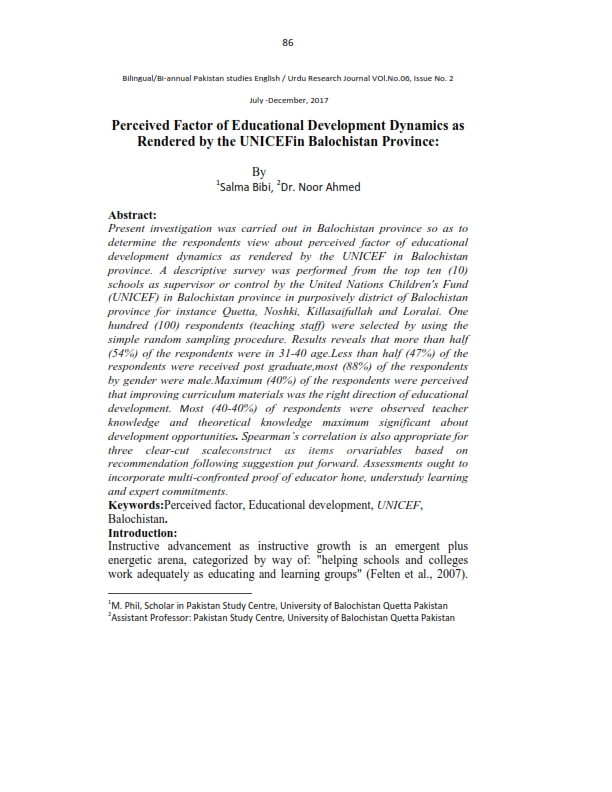 Perceived Factor of Educational Development Dynamics as Rendered by the UNICEFin Balochistan Province