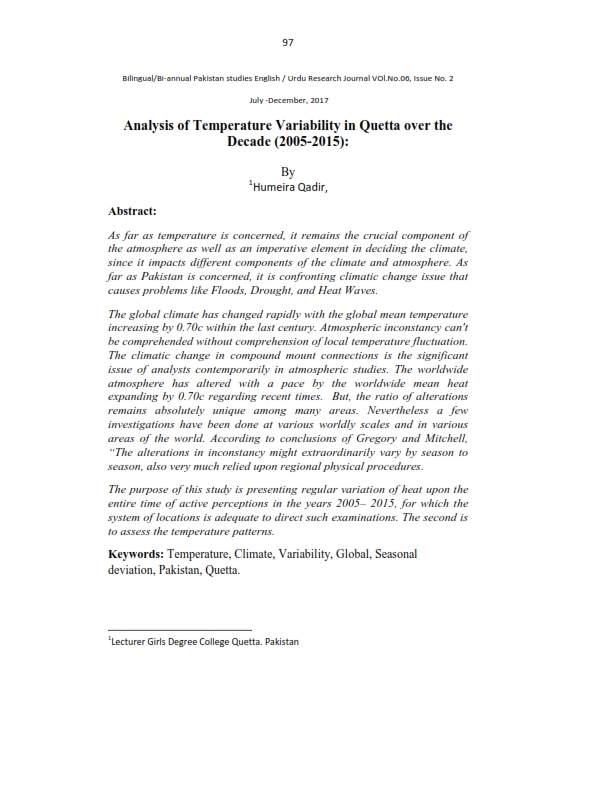 Analysis of Temperature Variability in Quetta over the Decade (2005-2015)