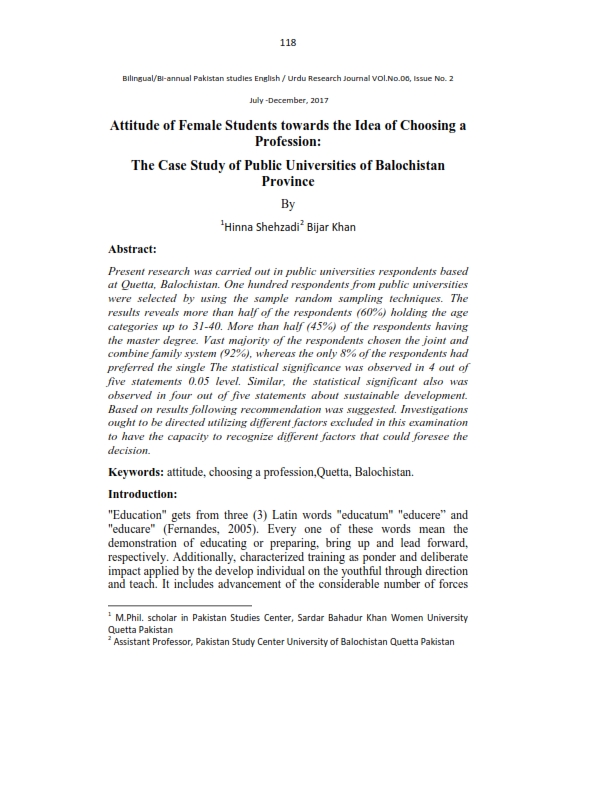 Attitude of Female student towards the idea of choosing a profession The Case Study of Public Universities of Balochistan Province