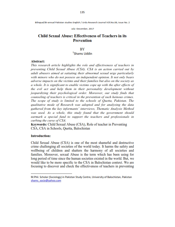 Child Sexual Abuse Effectiveness of Teachers in its Prevention