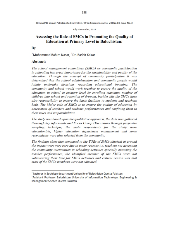 Assessing the Role of SMCs in Promoting the Quality of Education at Primary Level in Baluchistan