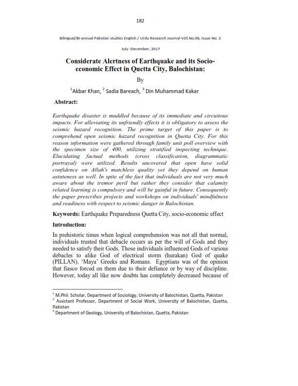 Considerate Alertness of Earthquake and its Socio- economic Effect in Quetta City, Balochistan