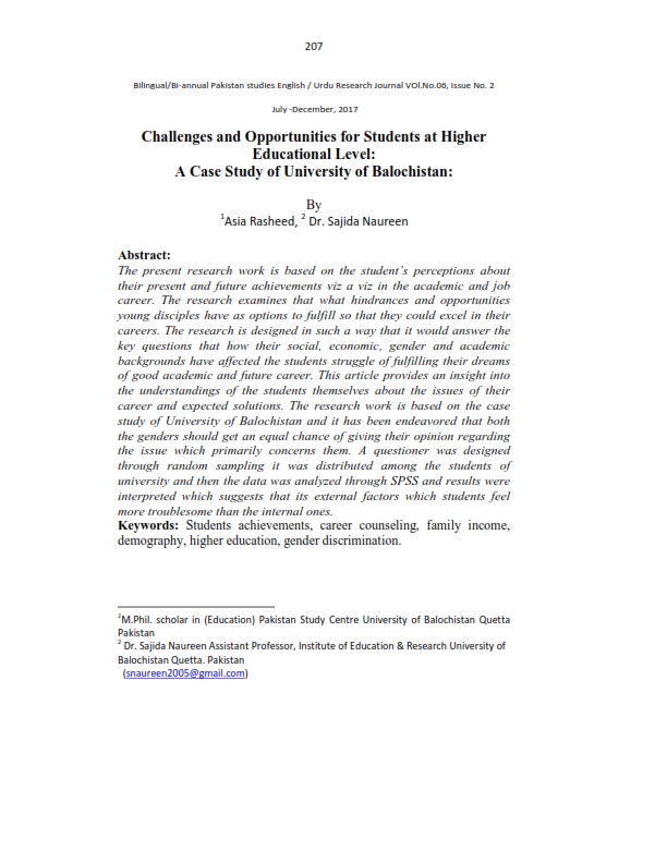Challenges and Opportunities for Students at Higher Educational Level A Case Study of University of Balochistan