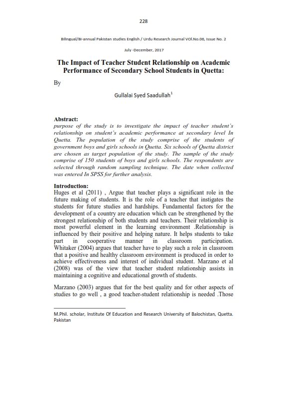 The Impact of Teacher Student Relationship on Academic Performance of Secondary School Students in Quetta
