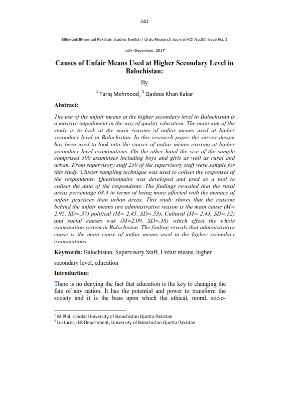 Causes of Unfair Means Used at Higher Secondary Level in Balochistan