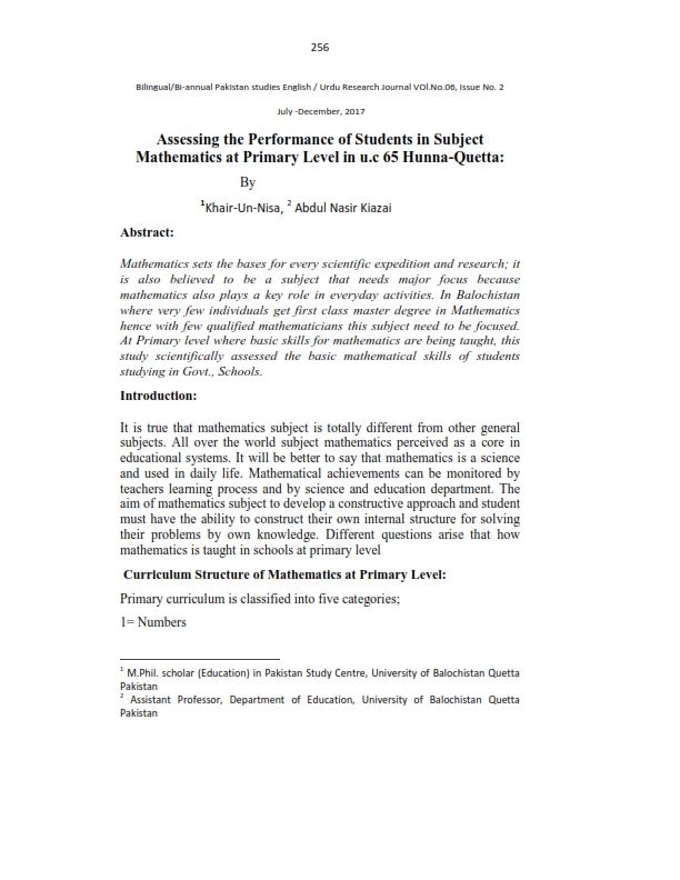 Assessing the Performance of Students in Subject Mathematics at Primary Level in u.c 65 Hunna-Quetta