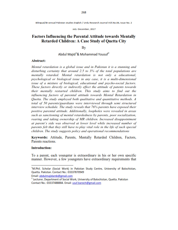 Factors Influencing the Parental Attitude towards Mentally Retarded Children A Case Study of Quetta City