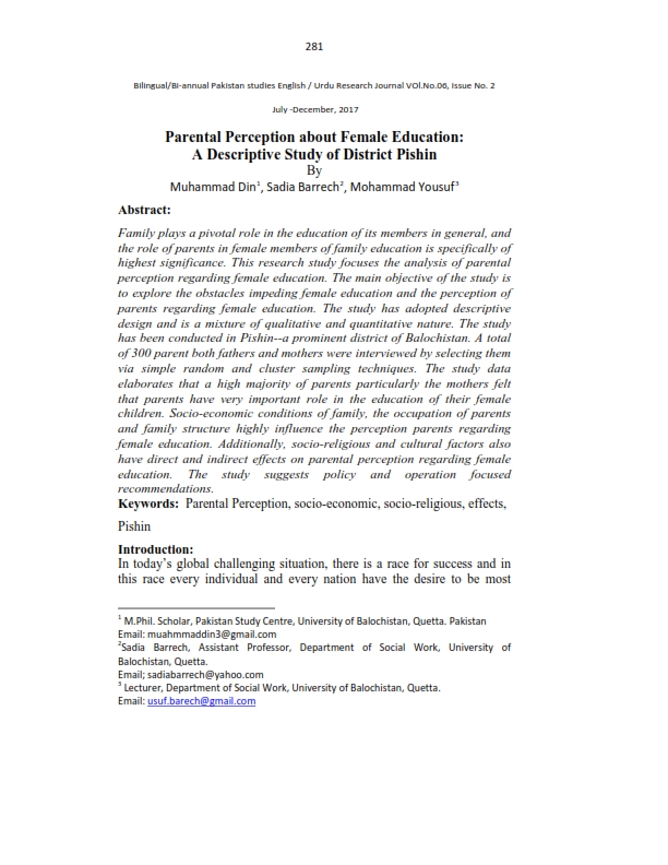 Parental Perception about Female Education A Descriptive Study of District Pishin