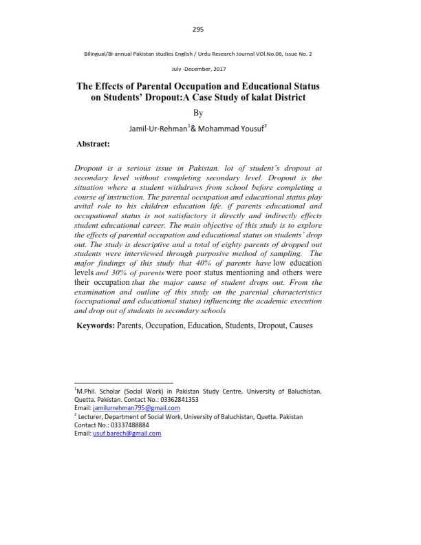 The Effects of Parental Occupation and Educational Status on Students’ Dropout A Case Study of kalat District