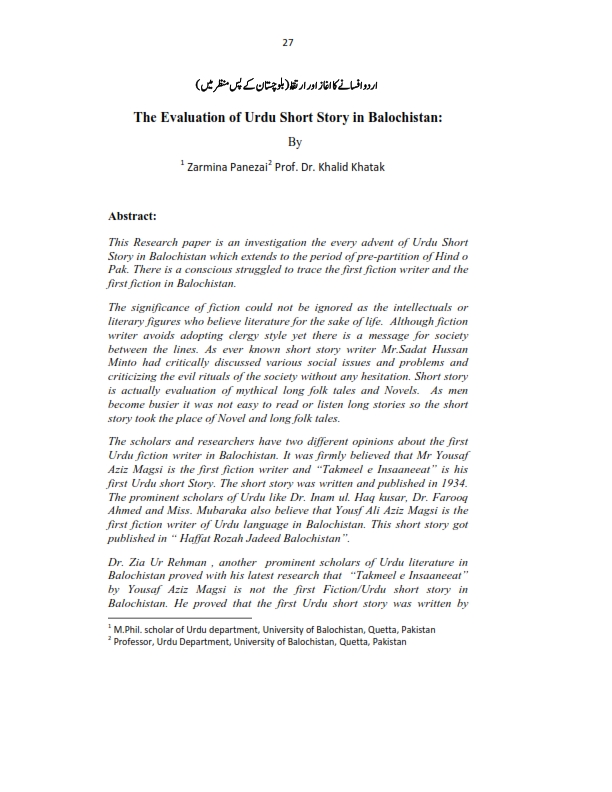The Evaluation of Urdu Short Story in Balochistan