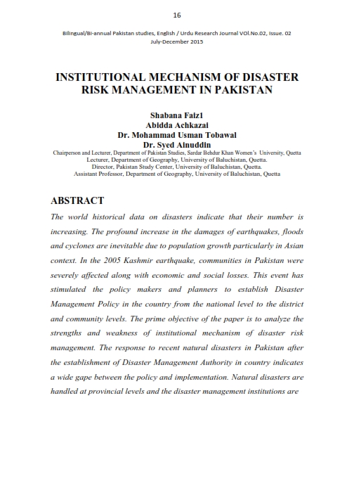 INSTITUTIONAL MECHANISM OF DISASTER RISK MANAGEMENT IN PAKISTAN